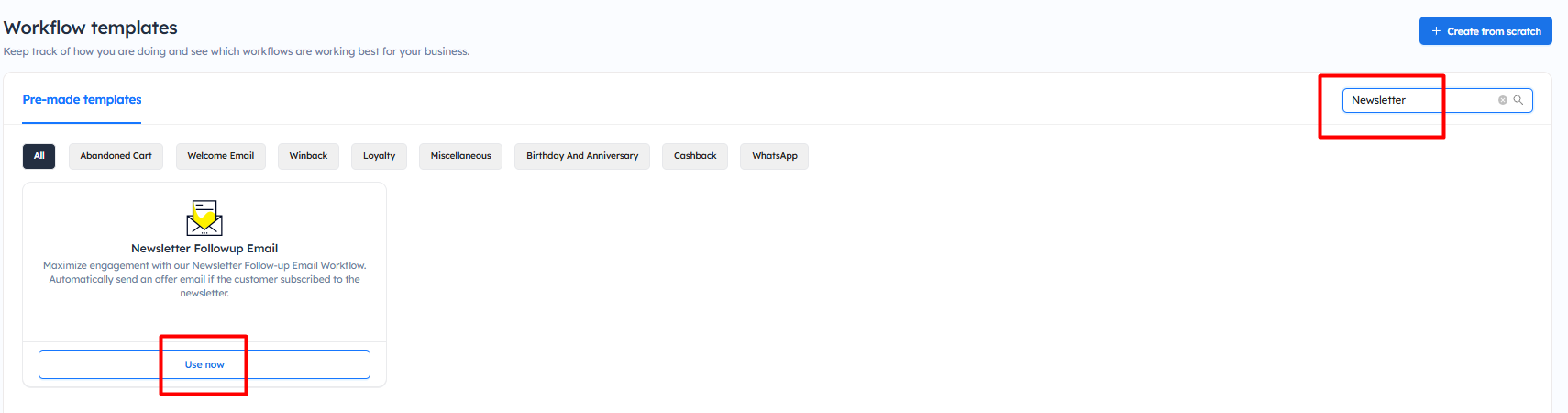 Step 2: Search for Newsletter and click on the Use now button on the Newsletter pop-up template.