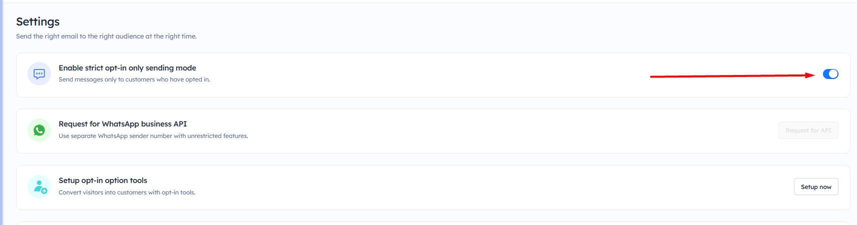 Step 2: Enable the settings of Enable strict opt-in only sending mode.