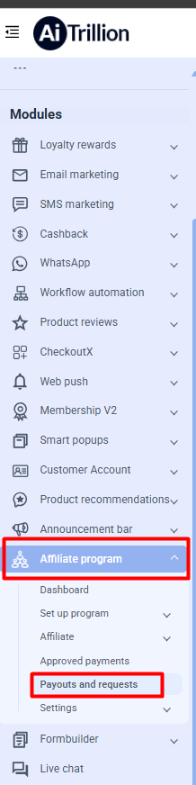 Step 1: Go to Affiliate Program >> Payout and requests.