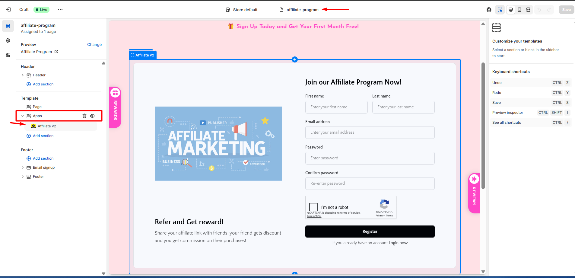 Here are the steps to show Affiliate V2 at the Front store if the App block is not available on your theme -: