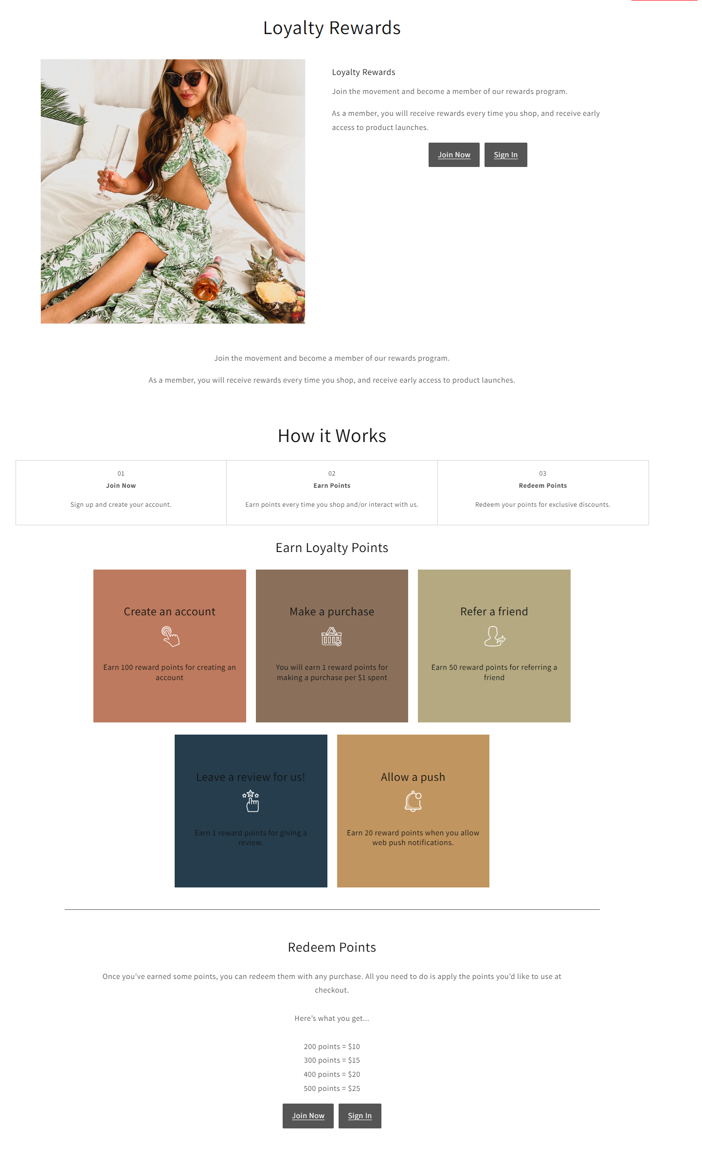<p><span>Once you’ve earned some points, you can redeem them with any purchase. All you need to do is apply the points you’d like to use at checkout.</span><br><br><span>Here’s what you get...</span><br><br><span>200 points = $10</span><br><span>300 points = $15</span><br><span>400 points = $20</span><br><span>500 points = $25</span></p>