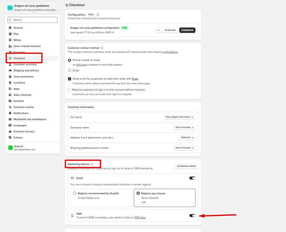 Step 2: Click on the Checkout tab >> scroll down to the Marketing options and enable the SMS button.