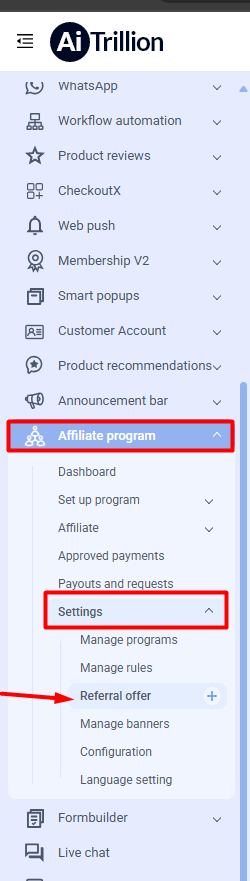 Step 1: Go to Affiliate program >> Settings >> Referral offer