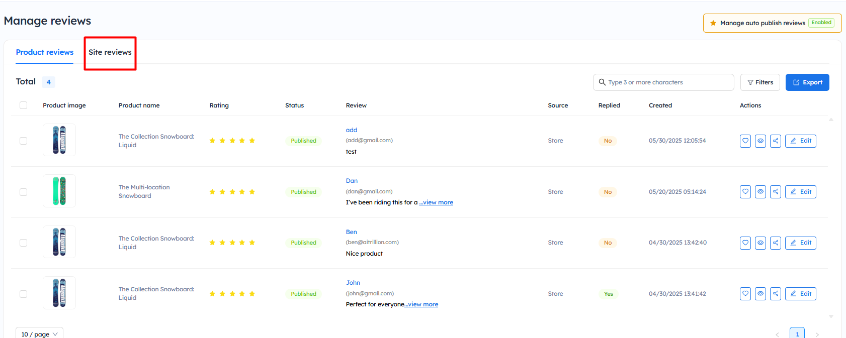 The same steps apply to both Product Reviews and Site Reviews—just select the appropriate tab.