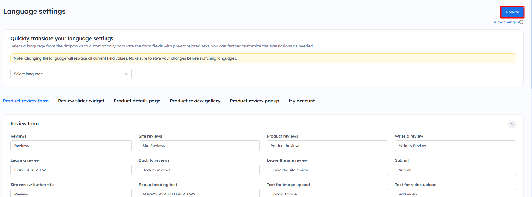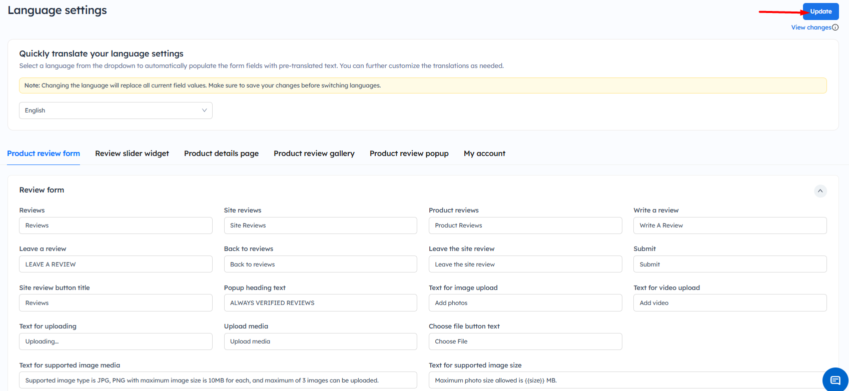 Update Text and Language in the Reviews Widget