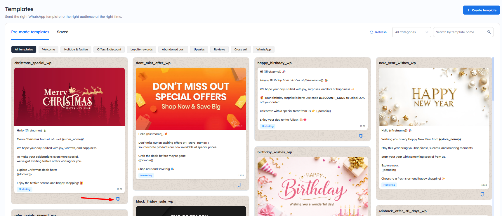 Step 2: Go to the tab based on the template category you want to select, and click the copy icon for the template you would like to use. For example, I am using the welcome_template.