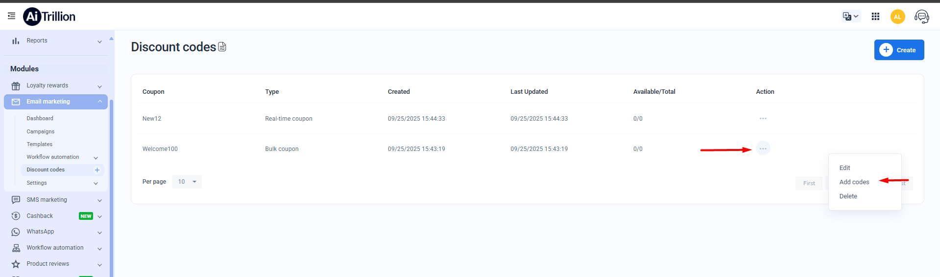 Introduction Use the AiTrillion email to automatically generate a discount code for every email that goes out with the Dynamic Discount addon. Here are the steps to generate a dynamic discount code to use in the email: Step 1. Go to Email Marketing > ...