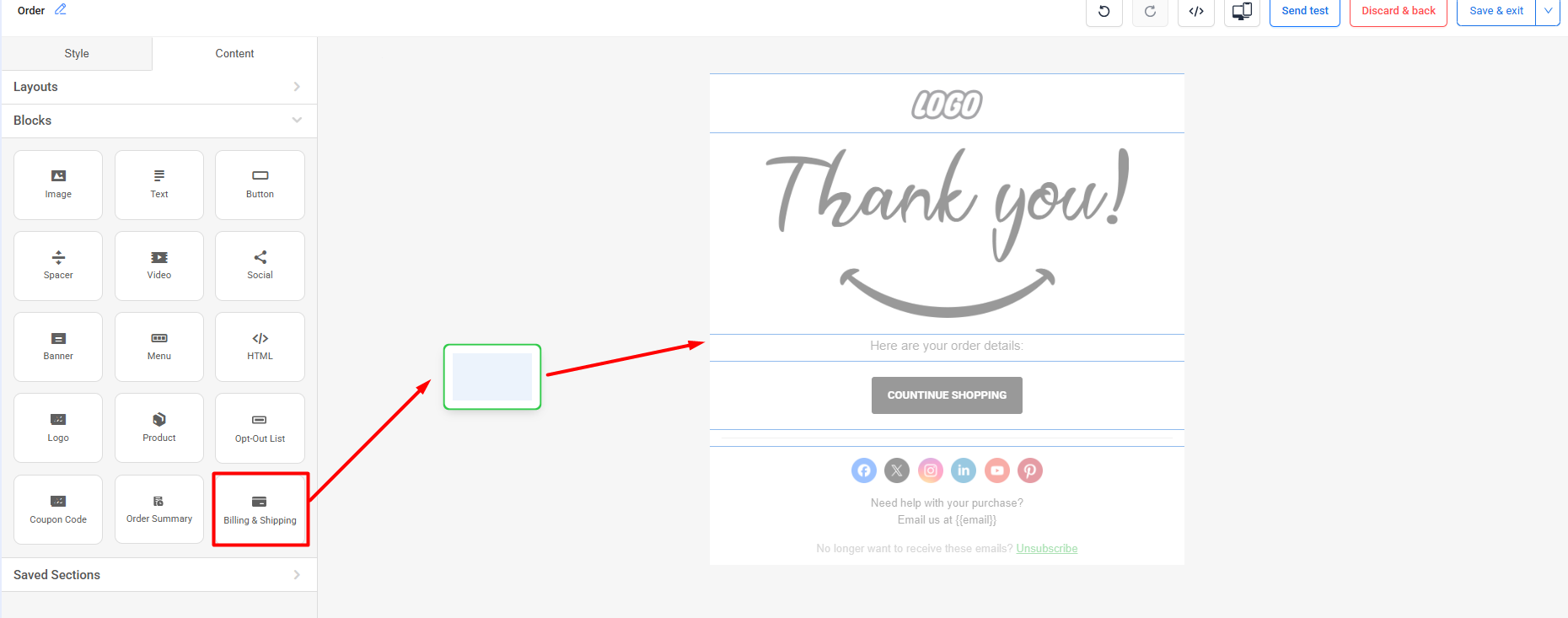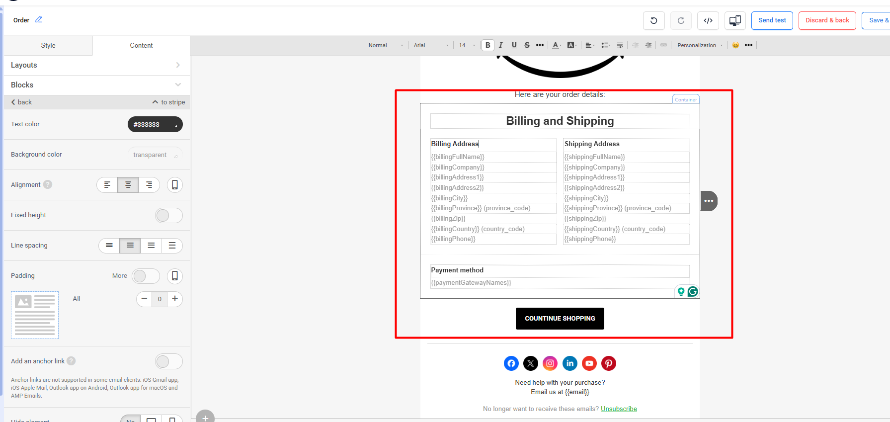 The new Email Design Editor makes it easy to display billing and shipping information clearly and professionally in your email templates. By using dynamic placeholders, you can automatically pull customer-specific details such as billing address, shipping address, and order information into transactional and notification emails. This ensures accuracy, improves customer communication, and helps create a consistent post-purchase experience without any manual effort.